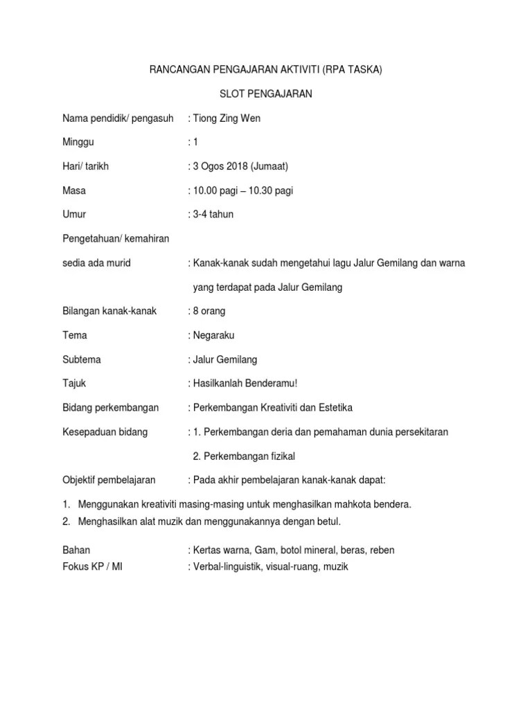 (kti 1.2.10) menghasilkan karya yang menggabungjalinkan pelbagai teknik … Bidang perkembangan kreativiti dan estetika. Rancangan pelaksanaan aktiviti (minggu 12) hari isnin. Contoh rancangan pengajaran harian prasekolah, tadika dan taska : Kti 2.1.13 menyanyi dengan gerakan. Jan 01, 2013 · tunjang : Rancangan pengajaran harian nama guru :